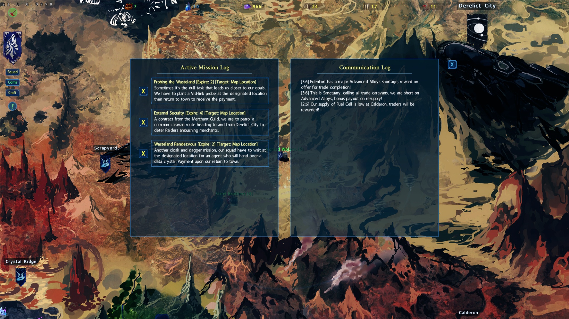 The difference will be this time, progress will be tracked and the quantity they require will be known. When you mouse-over a trade mission icon, it will display the vital info so you can better make decisions. In the above example, Sanctuary needs 30x Salvage (Alloys from space wreckage), the mission will remain active for 4 days.
